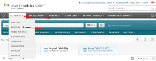 Schaue dir zunächst die wichtigsten Keywords an, für die du aktuell schon rankst. Du kannst dafür zum Beispiel Seachmetrics oder Sistrix verwenden.
