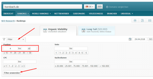 Filter dir dann all jene Keywords heraus, bei denen du aktuell zwischen Position 4 und Position 20 rankst – die Schwellenkeywords also.