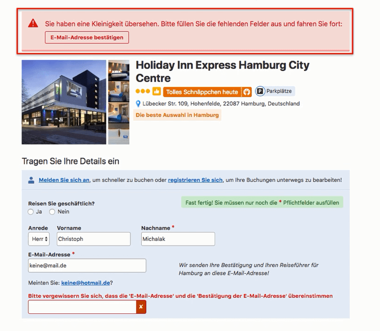 Ein anderes Beispiel für ein konstruktives, Conversion-förderndes Feedback auf Seiten ist die Online-Validierung bei Formularen. Sage deinen NutzerInnen direkt, wenn sie etwas falsch gemacht haben und sage ihnen auch, wie es richtig sein muss. Dann können sie ihre Fehler ohne großen Aufwand korrigieren.