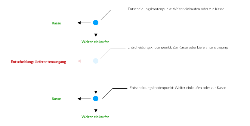 Die Logik ist, dass mit der Entfernung des Entscheidungsknotenpunktes aus der Entscheidungsarchitektur die Option für den Kunden oder die Kundin, den Markt hier vorzeitig verlassen zu können, entfällt. Ohne diese Option wird der oder die KundIn entweder zur Kasse gehen oder den Einkauf fortsetzten, so sein bzw. ihr Kalkül.