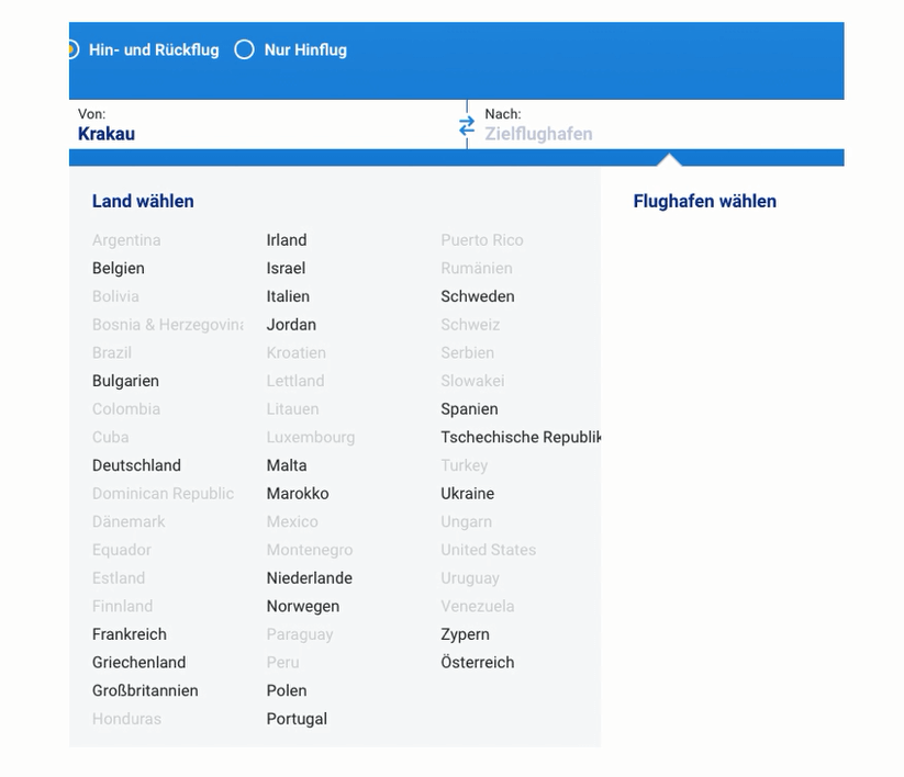 Dieses Werkzeug kannst du auch im Zusammenspiel mit der Fehlervermeidung nutzen. Wenn ein Nutzer bzw. eine Nutzerin beispielsweise einen Startflughafen auswählt, kannst du ihm oder ihr anzeigen, welche Ziele von dort überhaupt angeflogen werden.