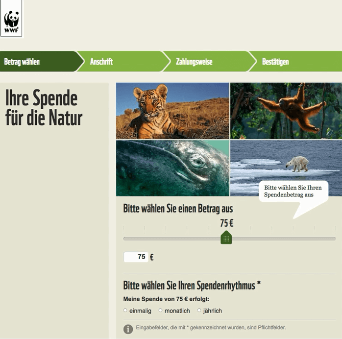 Gerade wenn es um Spenden geht, sind Defaults eine starke Waffe. Der WWF hat im folgenden Beispiel eine voreingestellte Summe festgelegt. Diese Voreinstellung (Default) wird dazu führen, dass der Durchschnitt der geleisteten Spenden signifikant in Richtung des Defaults von 75 € verschoben wird. BesucherInnen, die ohnehin zwischen 50 € und 100 € spenden wollten, fühlen sich bestätigt und werden von einer Entscheidung entlastet. Diejenigen, die eigentlich nur 10 € spenden wollten, werden durch den „Anker-Effekt“ zum einen höheren Betrag „gezogen“ – hier spielen sich der Default und der Anker-Effekt gegenseitig zu.
