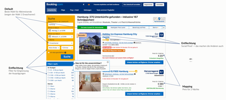 Dies funktioniert beispielsweise auf Buchungsseiten durch den Einsatz von Filtern. Nach Amon Tversky (1972) gilt dann die „Elimination-by-Aspects“-Regel, die durch immer weiteres Ausschließen alle verfügbaren Optionen auf jene eingrenzt, die auch wirklich zu den Wünschen des Nutzers bzw. der Nutzerin passen.